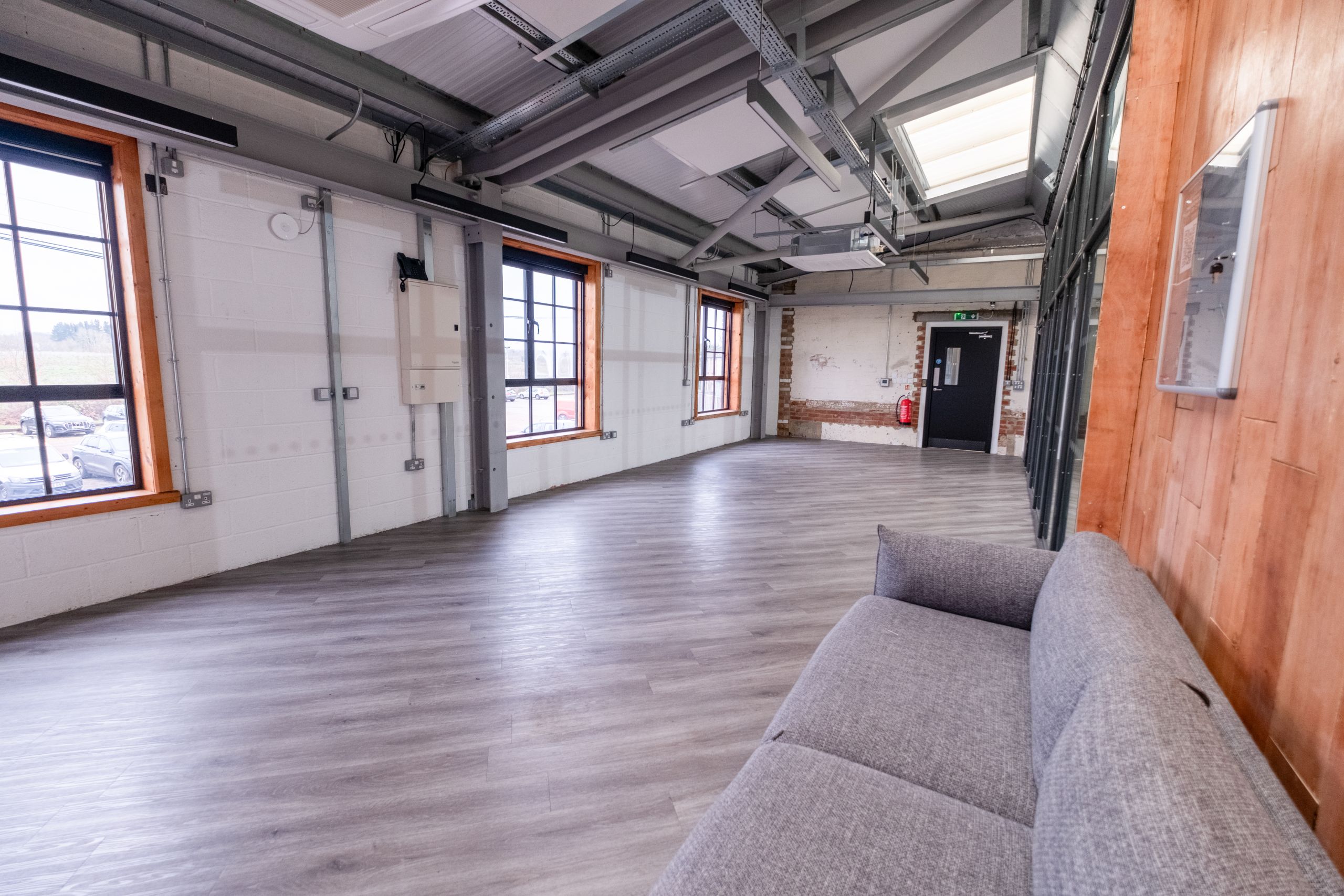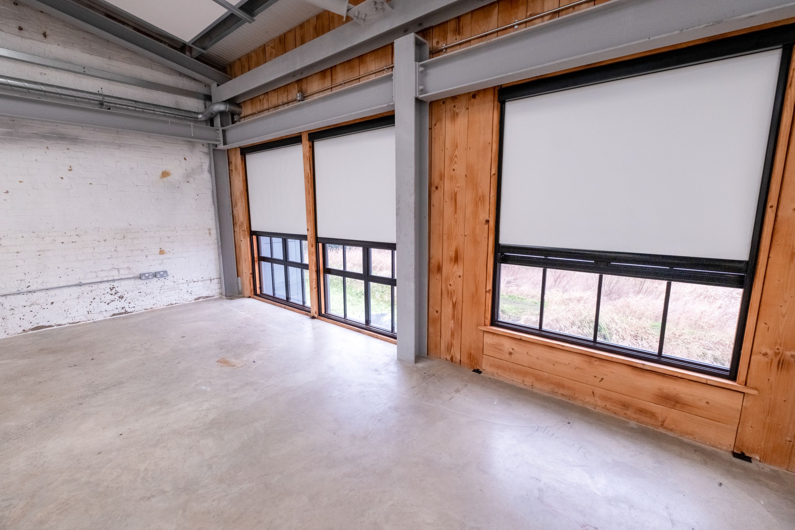 A striking exposed brick wall runs through the space, adding warmth and visual interest, while large windows overlooking the River Wey Navigation allow the studio to be flooded with natural light when required. The entire studio is fitted with electronic blackout blinds, making it quick and easy to switch between full blackout and daylight configurations.
